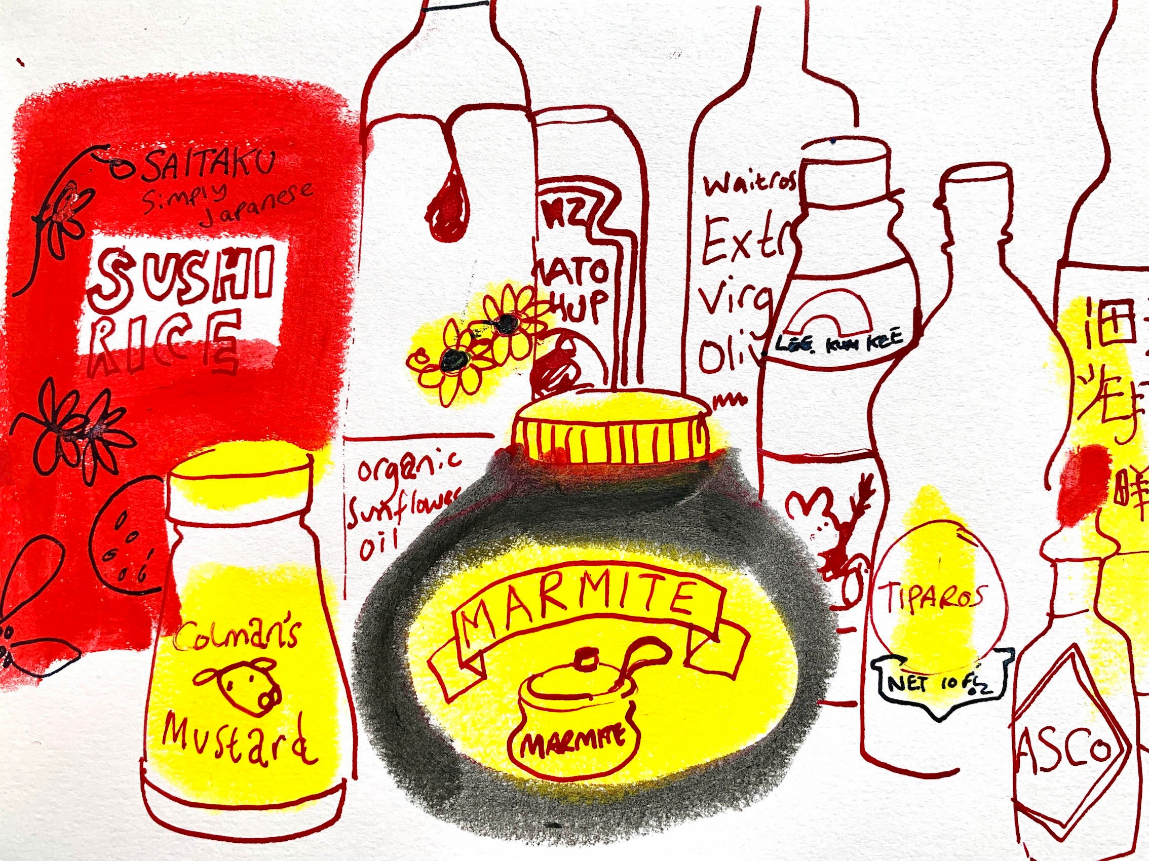 I’ve always loved food packets. I love the quality of the Marmite jar and the golden syrup tin. With a can of baked beans anyone can be the owner of a design classic. As a child I would repeatedly watch adverts for Coco Pops, Milky Way bars, even the Findus Crispy Pancake, and with my cousin Maisie repeat the slogans and songs ad infinitum, collapsing into hysterics as we shouted “COCO POPS ARE SO CHOCOLATEY THEY EVEN TURN THE MILK BROWN!”