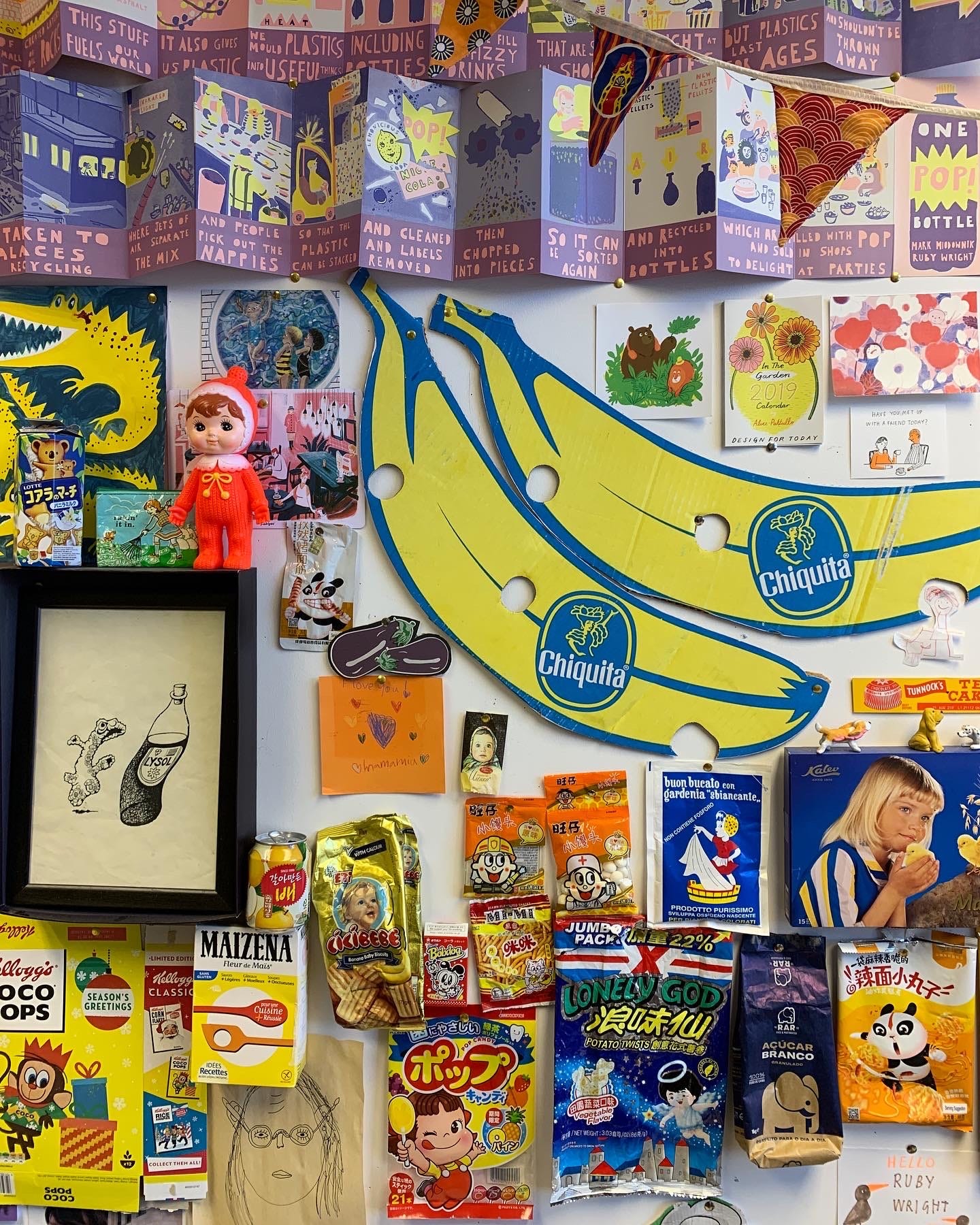 My oasis in the lockdown desert was Friday night Art Club, hosted on instagram by The Good Ship Illustration. Illustrators Helen Stephens and Katie Chappel would cheerfully broadcast an hour of drawing prompts and people like me across the globe would sketch along, live, from our homes. We drew what was around us with the materials we had to hand. I regularly assembled a collection of food packets from the kitchen cupboards and escape into my sketchbook for an hour.