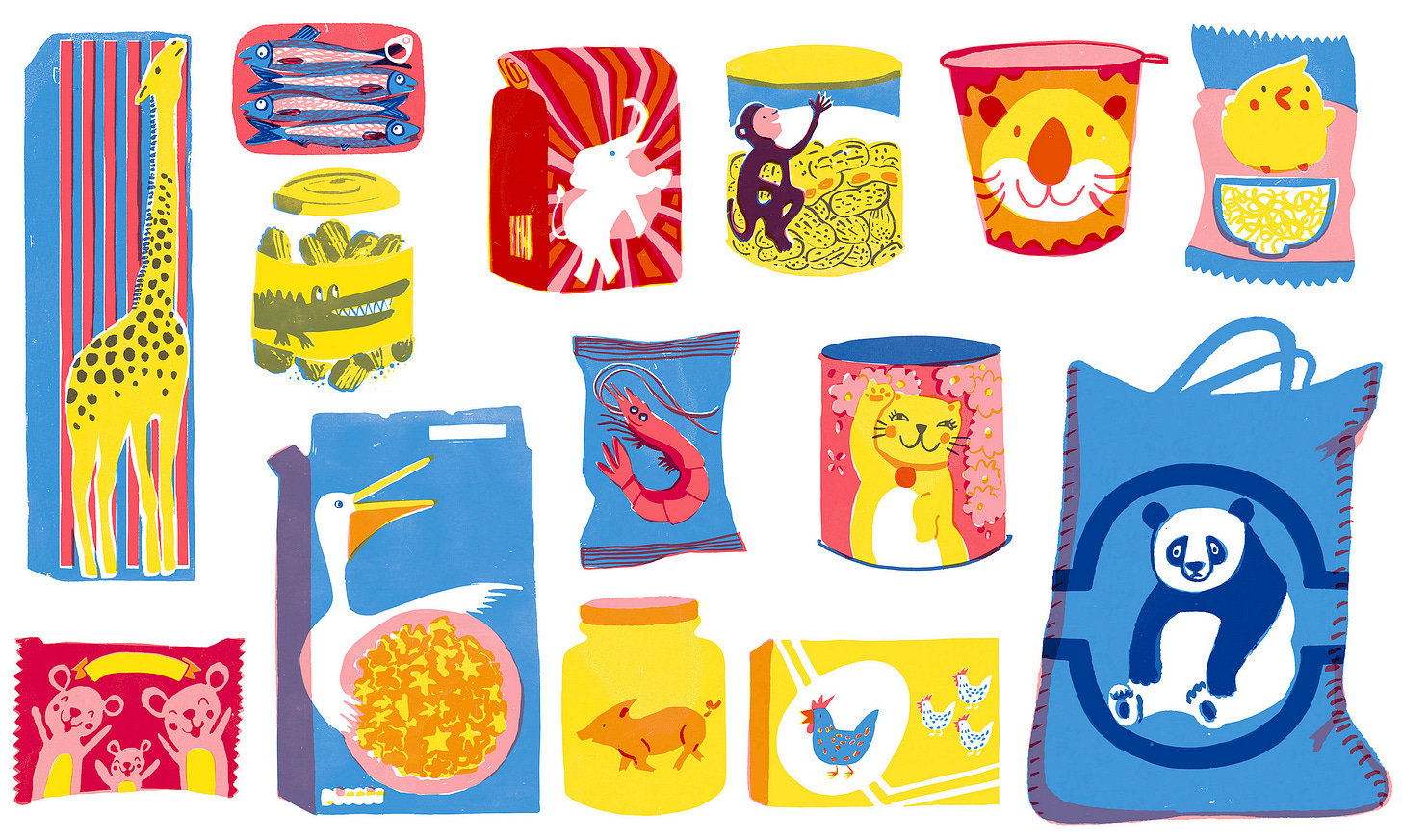 I asked Libby if I could use the real lion from the syrup tin and the monkey from the coco pops, and she suggested that I design my own range of food packets. I knew I wanted to make the whole book using screen print, and that worked brilliantly for the food packets. But I really struggled with the main character, the little girl, Maisie. Then my husband suggested I treat her in the same way as the animals, imagine her as a character printed on a food packet, and that was such a helpful piece of advice. I drew Maisie as if she was on a food packet, then I drew her holding a pig (we ended up not including a pig in the final book) and drew her doing various different activities, which was a brilliant Orange Beak tip.