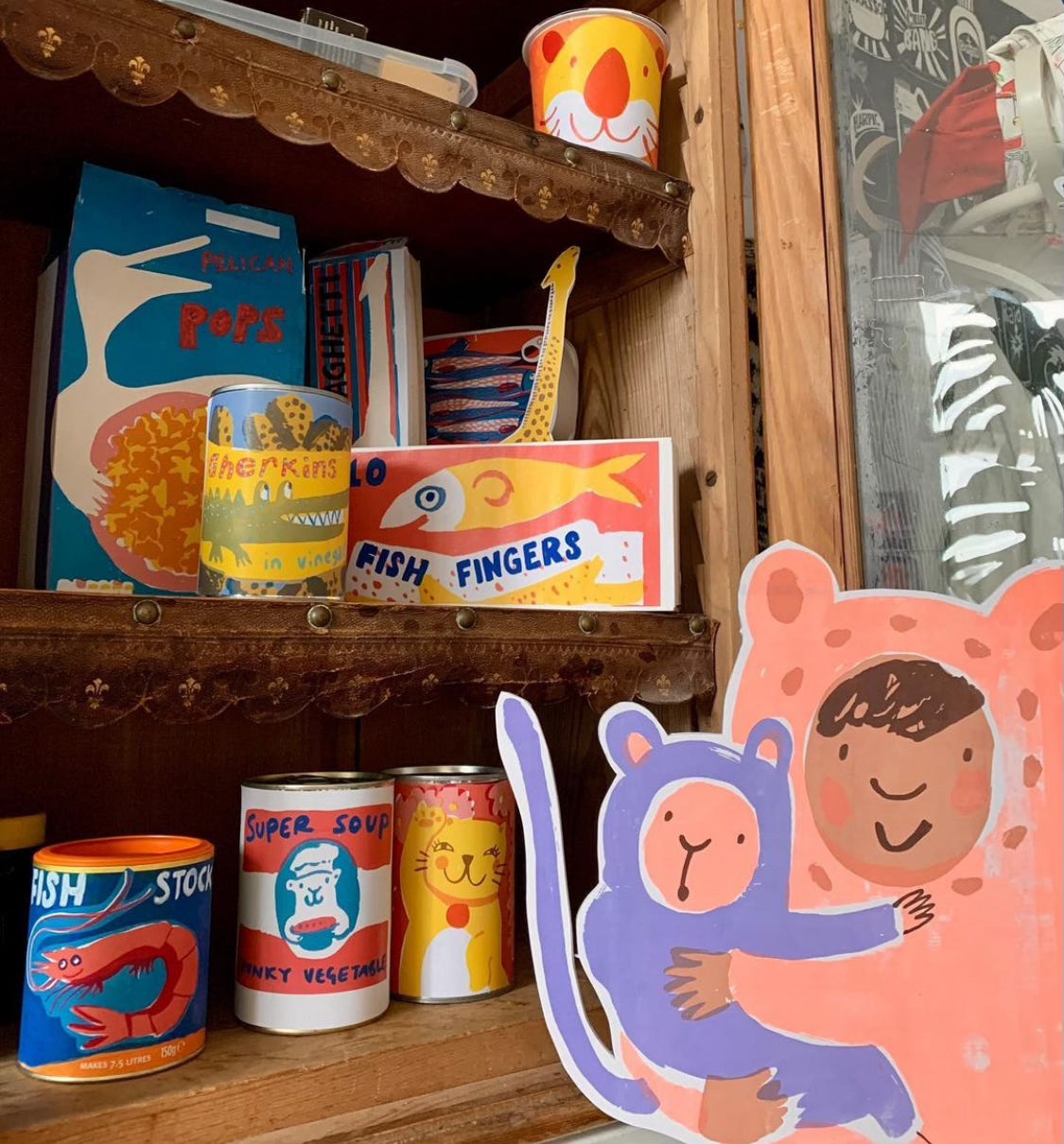 The final thing I did, and I’m really glad I did this, was to make some props to put inside the windows. In my case I made a cutout of my main character and some packets and tins which appeared in the story. When I was having doubts about whether or not the window painting was good enough I was pleased that I had these extra little bits and pieces to pull it all together.