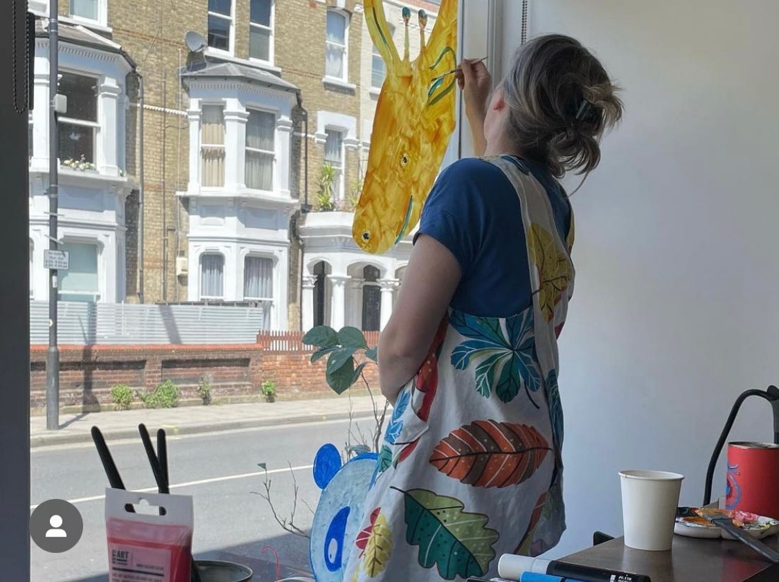 Practicing at home is crucial, as is giving yourself enough time on the day of the window painting. I turned up as soon as the staff arrived to give me as much time as possible. In the end I think each window took me about three hours but the weather was hot (boiling in those windows!) so the acrylic paint dried fast. Claire Alexander showed me a great tip if you don’t want your acrylic to dry out too fast in any situation, she wet a kitchen towel, placed it on a palette and then put greaseproof paper or similar on top which you then put the paint on. The damp paper towel slows down the drying time.