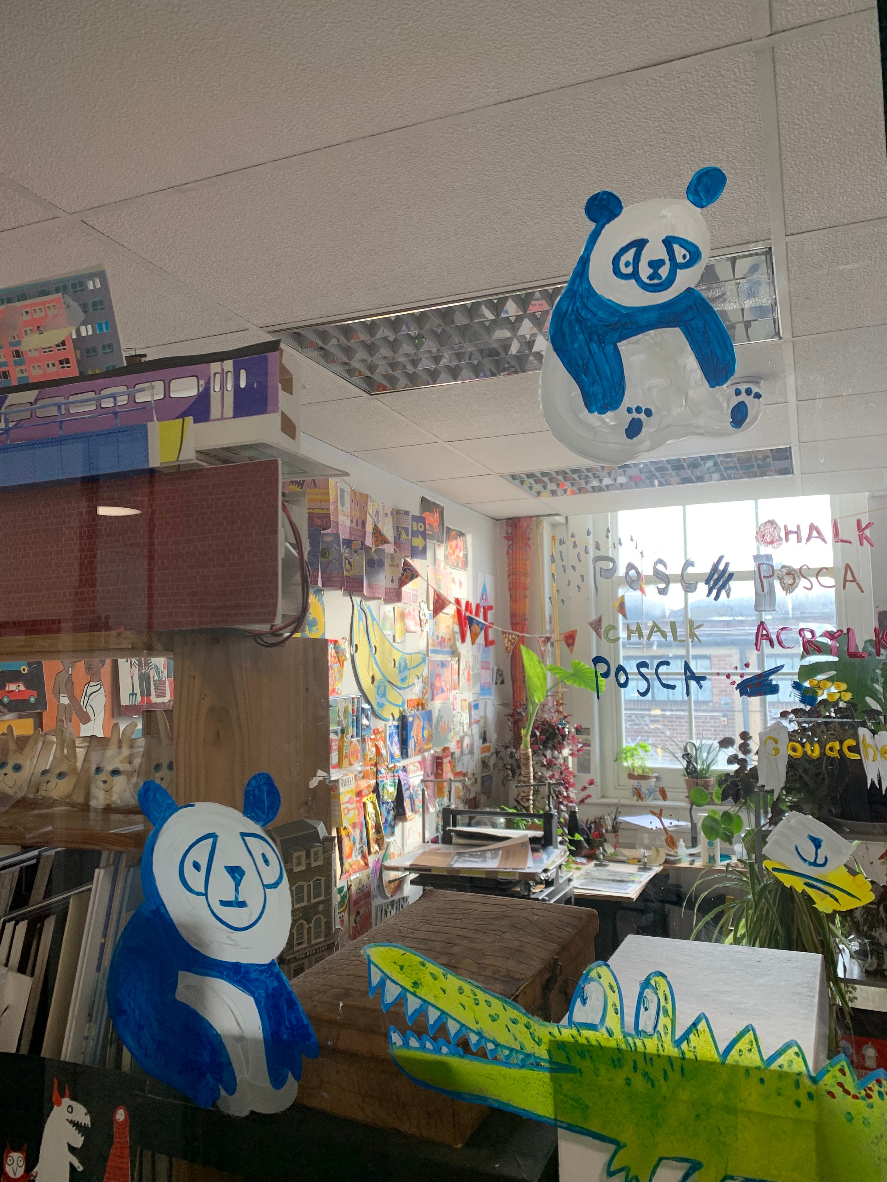 Posca pens are great, as are these window painting pens which wipe off really easily. Some people use Woody Pencils. But the most affordable material is acrylic paint. I found I used a lot. Particularly white. The thing with windows is that because you paint the inside of the window but people view your work from the outside, you have to start with the top layer (I.e the details - for example the pupil of the eye, followed by the white of the eye, followed by the rest of the face) and work backwards so the last thing you paint is the background.