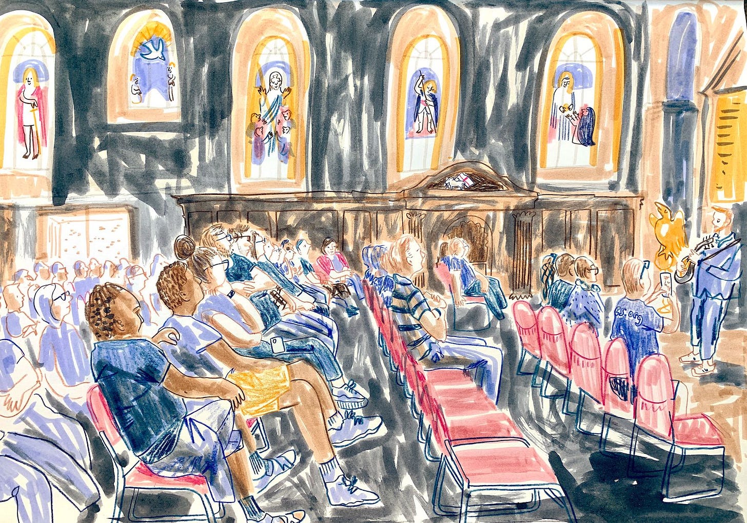 Holy Trinity Church, Guildford. Music by Great Russell. Although walkers came from many faiths and none (like myself), we were often hosted by churches. It was spectacular to be in these places, receiving kindness from strangers. Refugee Tales evenings are open to people from the local community and are a mixture of readings from the Refugee Tales books which are often harrowing first-hand experiences of exile and detention, followed by riotous and joyful music and dancing.