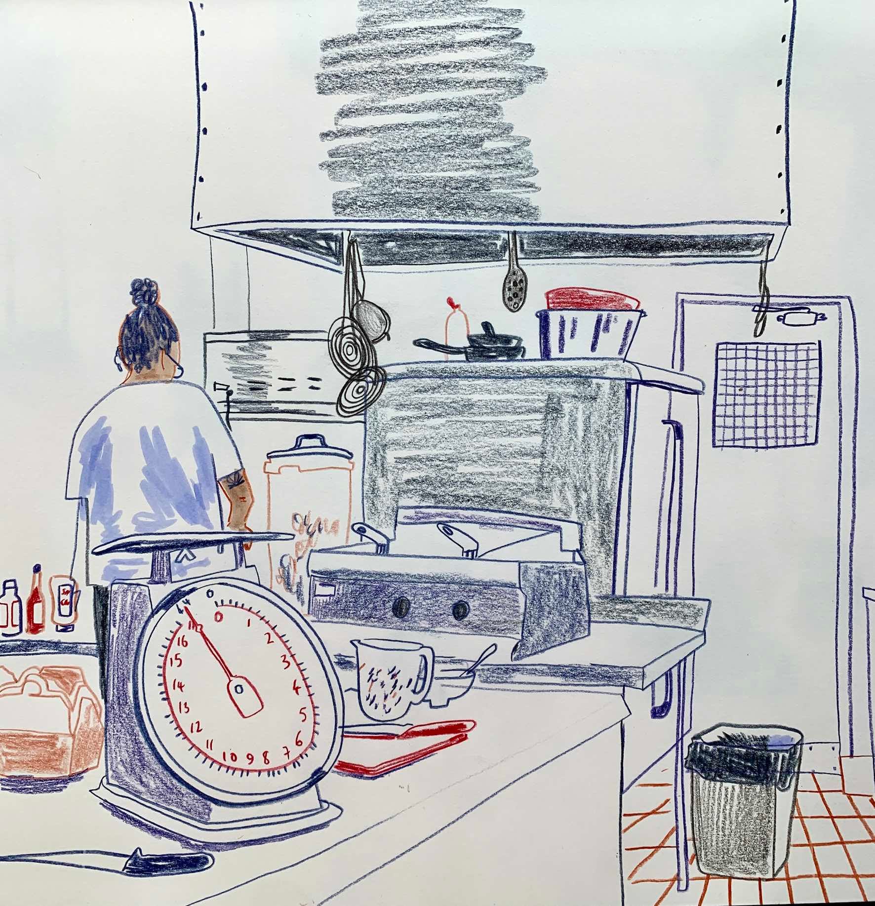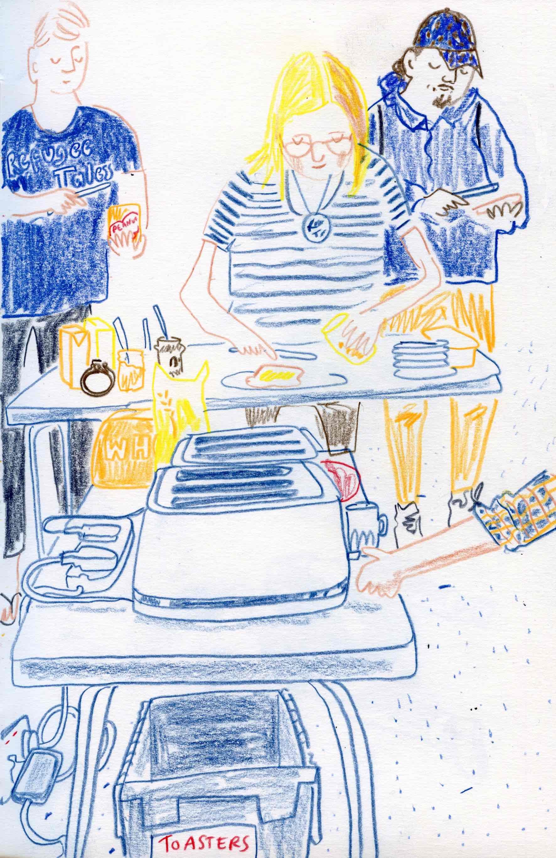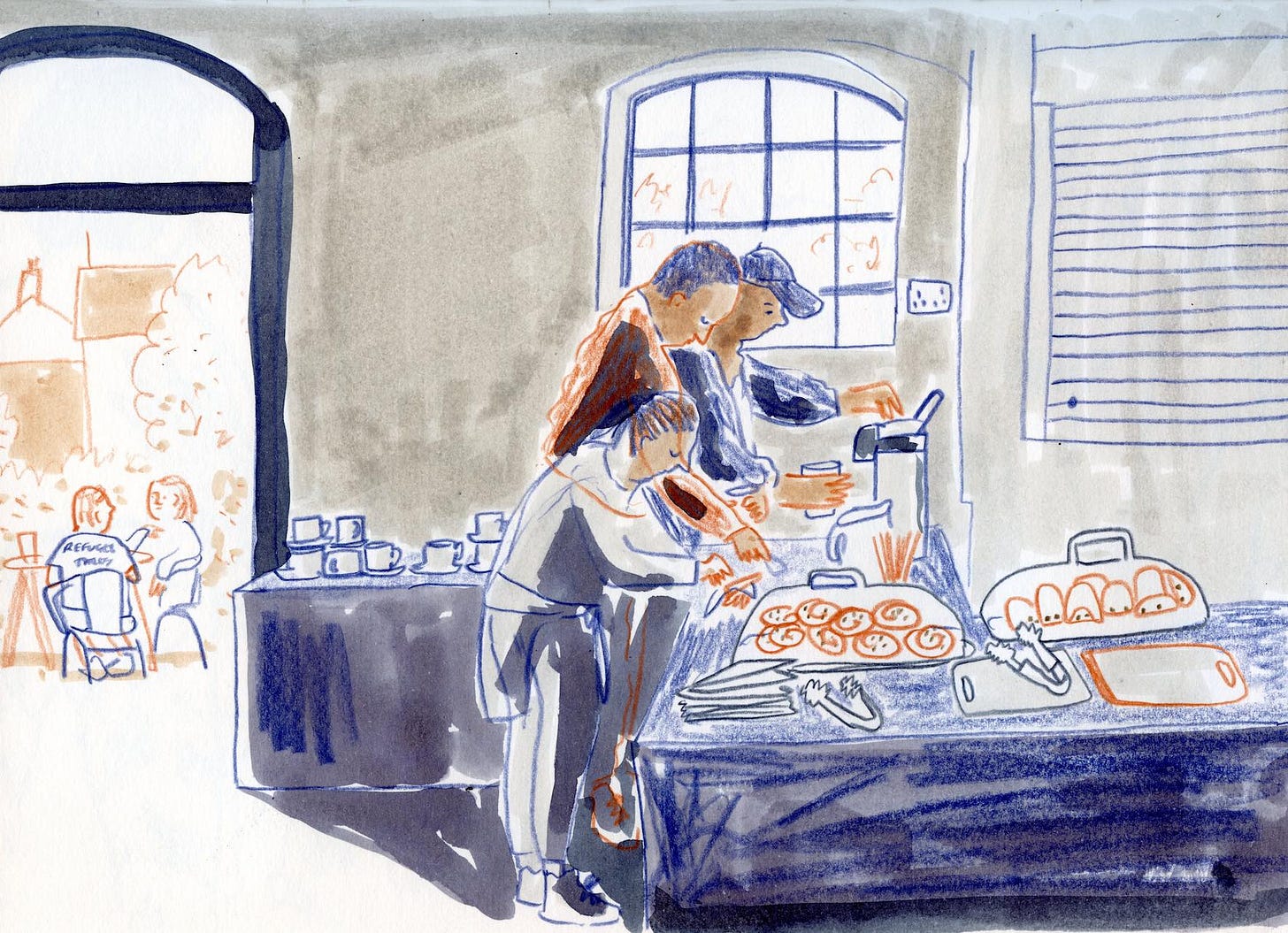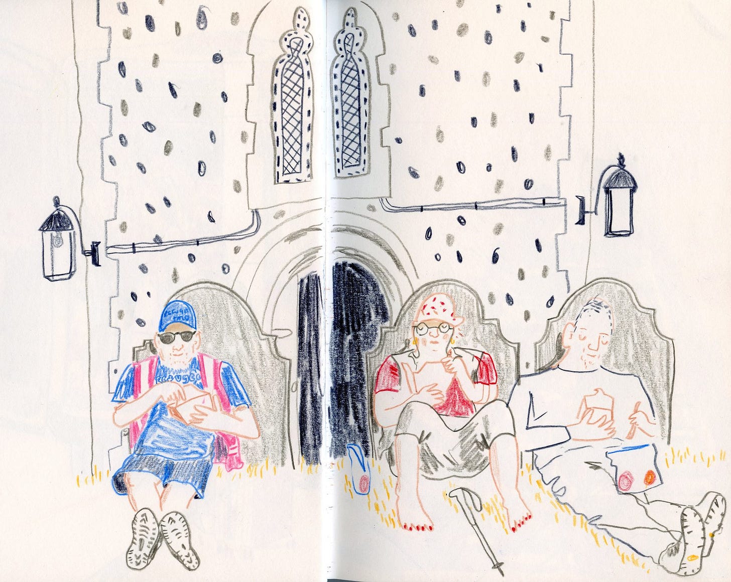 Breakfast in Guildford. Breakfasts are really important and I wanted to document the work that goes on behind the scenes that keeps the walkers walking. Also I had tried previously to draw while we walked, I made myself a tool belt style pencil wrap, but I got travel sick when I tried to draw on the hoof, so it was the stuff around the walk that I decided I could best capture.